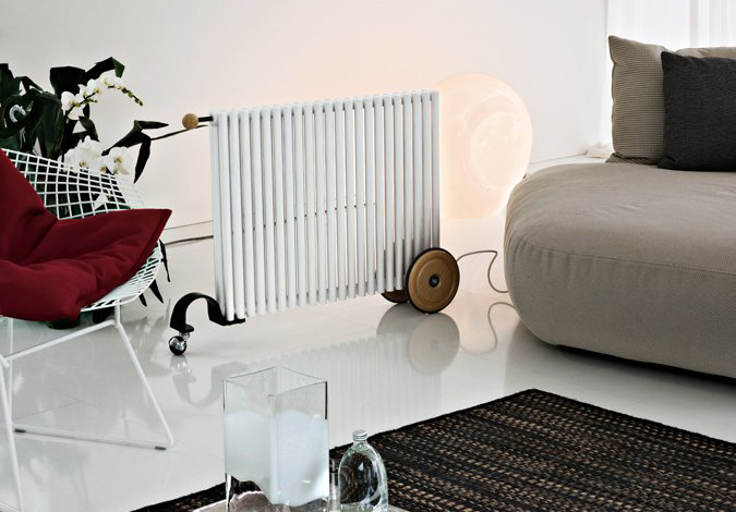 Radiatore elettrico portatile dal design originale e giocoso. Si può trasportare facilmente grazie alle grandi ruote posteriori in legno ed un pomello presente ad un’estremità. Il corpo radiante è composto da elementi tubolari disposti su due file disponibili in due diversi diametri (14mm e 25mm). Disponibile in diverse varianti cromatiche, anche su richiesta.