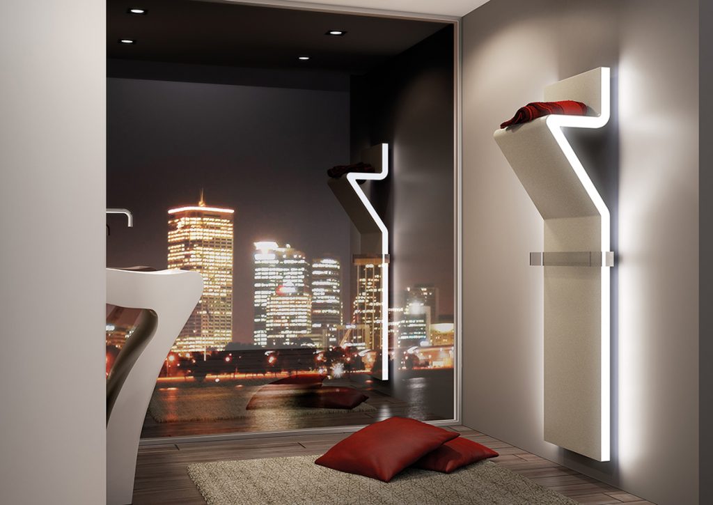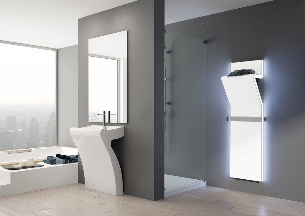 Linee fluide, eleganti e tridimensionali caratterizzano il particolare design di questo termoarredo. Due file di luci a led ne seguono i profili esaltando la silhouette. La particolare curva crea un comodo piano d’appoggio e la barra porta asciugamani realizzata in metacrilato trasparente rende il termoarredo completo e particolarmente funzionale per l’ambiente bagno. Disponibile nella versione idraulica ed elettrica e personalizzabile con un’ampia gamma cromatica.