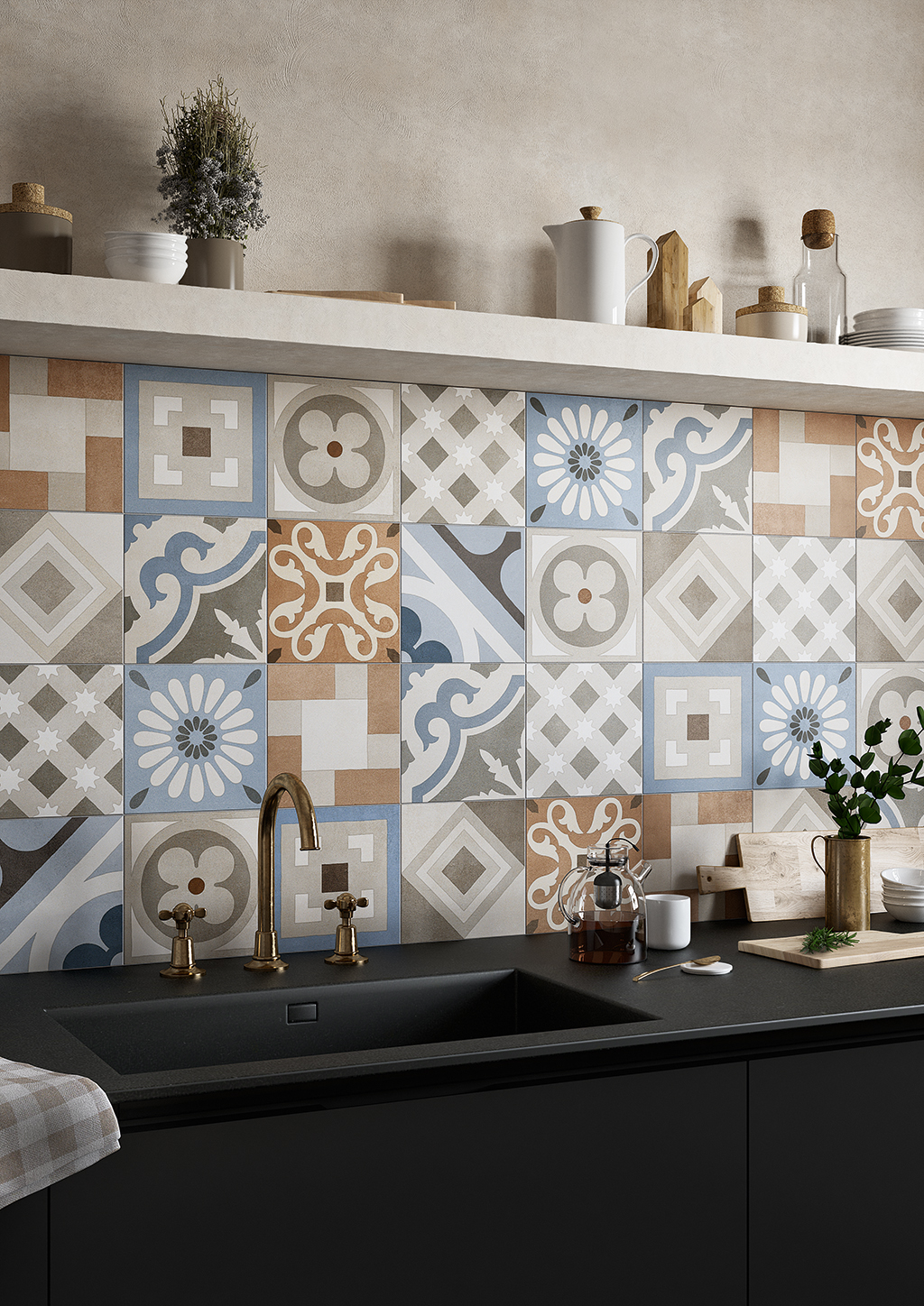 Rubinetterie o profili in ottone, bronzo o nero opaco possono riprendere o esaltare per contrasto i colori delle cementine, aggiungendo un tocco industrial oppure glamour, a seconda del contesto.
