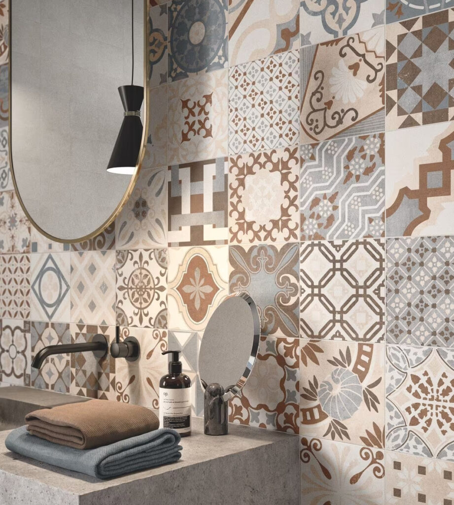 - Abbinamenti materici: grès effetto legno o pietra si abbinano alla perfezione ai pattern decorativi delle cementine, creando un mix&match di design.